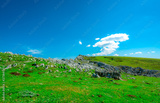 Landscape of green grass and rock hill in spring with beautiful blue sky and white clouds. Countryside or rural view. Nature background in sunny day. Fresh air environment. Stone on the mountain.
