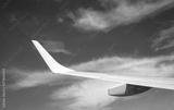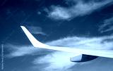 Wing of plane over white clouds. Airplane flying on blue sky. Scenic view from airplane window. Commercial airline flight. Plane wing above clouds. Flight mechanics concept. International flight.