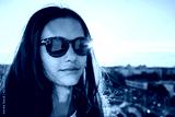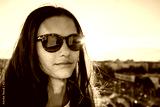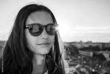 teen hipster girl in sunglasses, city street background, sunbeam reflected in glasses