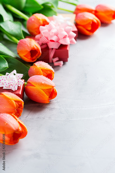 Spring background with orange tulips. women, mother day, greeting card