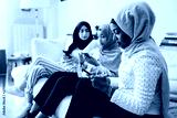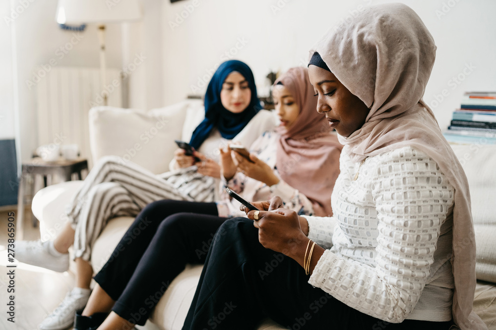 Three young millennials women use their smart phones on sofa - Arab friends surf the internet with their phones
