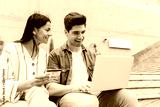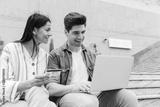 Happy young amazing loving couple business people colleagues outdoors outside using laptop computer holding credit card.