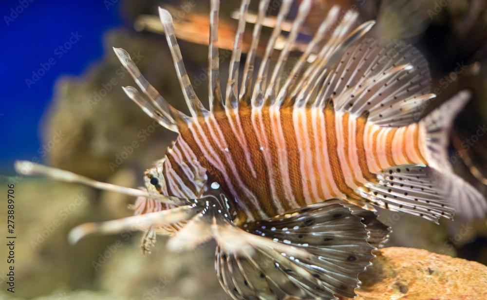 Pterois antennata, lionfish in the interior of the sea next to a coral reef, dangerous fish