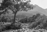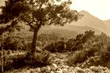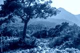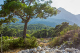 Mountain landscape, large pine tree growing on hill. Horizonal color photography.