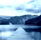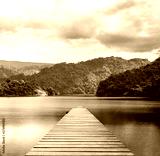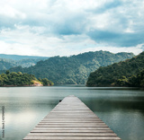 Wood bridge on the sea which has walk way for travel tourism with tropical forest island and sunshine with sky beautiful background for holiday destination for tourists.