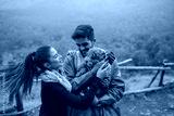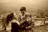 Cute multicultural couple standing in nature and playing with their loving dog. Man holding dog while woman petting it. Autumn season.
