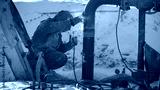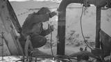 Worker produces pipe welding on the street. In winter, at low temperatures, it is difficult to mount the pipe wire.