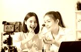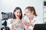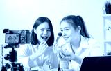 Two asian women beauty vlogger video online is showing make up on cosmetics products and live video on digital camera. Digital tablet monitor comment real time.