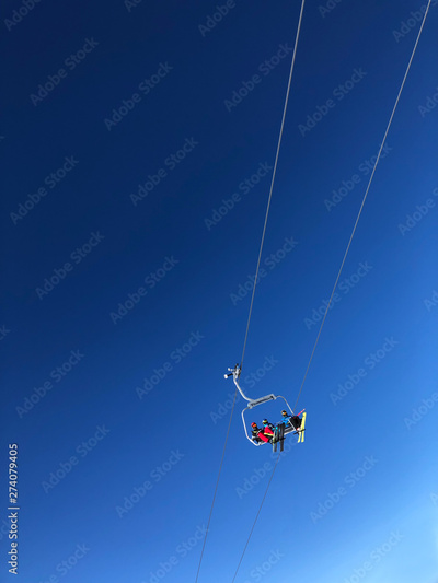 Skiers on a Ski Chair Lift In a Resort With Blue Sky