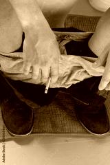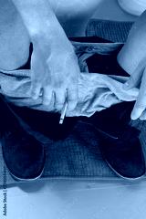 a man sits on a push in a toilet with constipation and smokes a cigarette