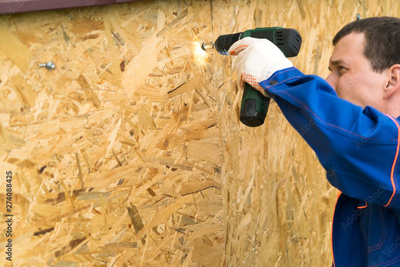 master in a blue uniform works as a screwdriver fastens wooden shields