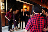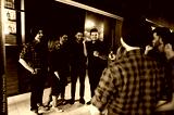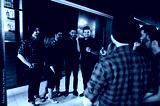 Group of indian friends having fun and rest at night club. They looking on mirror and making photos on phone.
