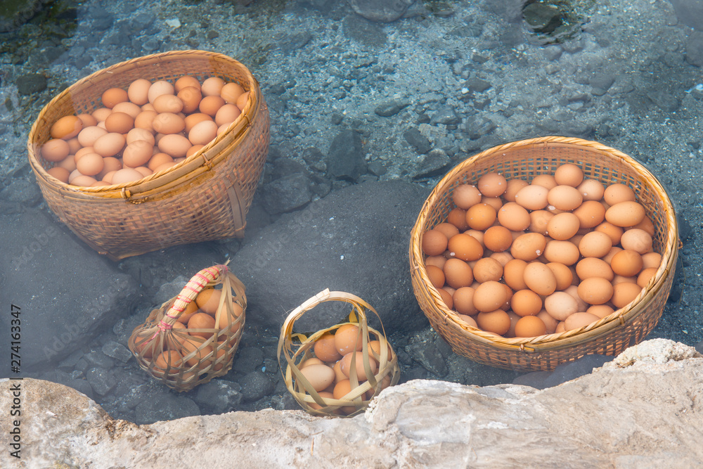 Close-up of boiled eggs soak in hot spring (cooked egg yolks and jelly egg), one of popular tourist activity when visiting Chae Son National Park the geothermal park in Lampang province of Thailand.