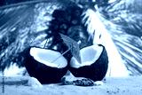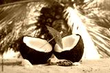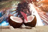 Time to travel. Two halves of a coconut with an umbrella on the beach against the backdrop of a palm leaf. Concept on the topic of tourism.