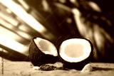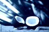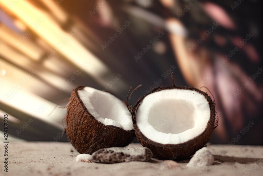 Time to travel. Two halves of coconut on the beach against the backdrop of a palm leaf. Concept on the topic of tourism.