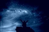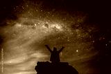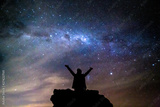 Silhouetted person hails the cosmos milky way starry night sky