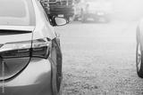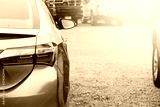 ฺBlack side of Yellow-green cars parked on the ground. or Taxi for transportation business at upcountry.