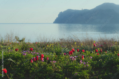 Shrenk's tulip in the wild against the backdrop of the sea