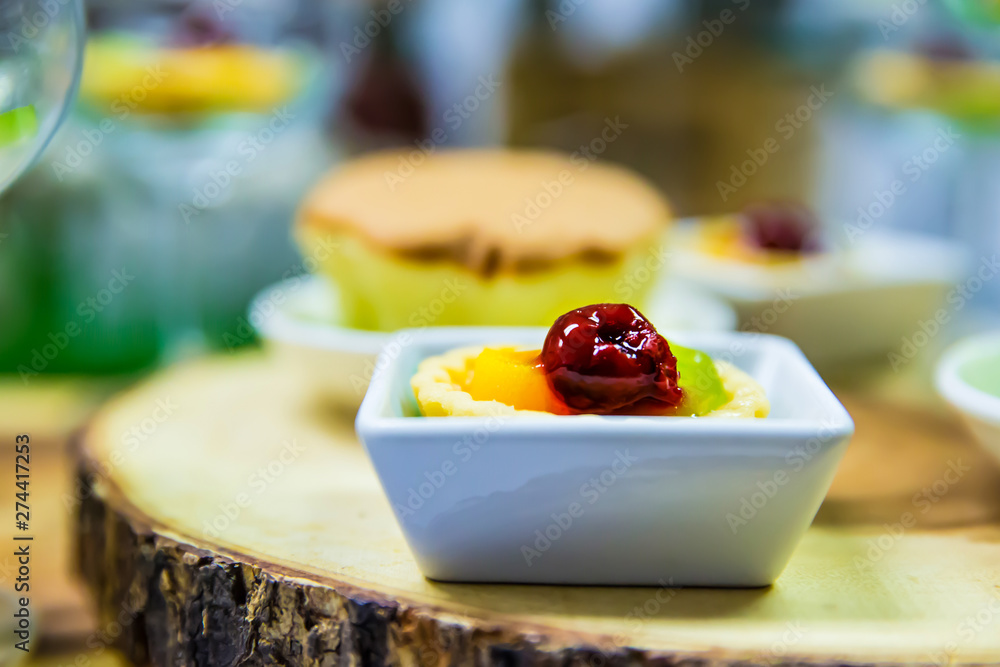 Close-up Fruit Tart in a cup,Cupcake and Sweets for take a break the meeting.