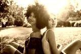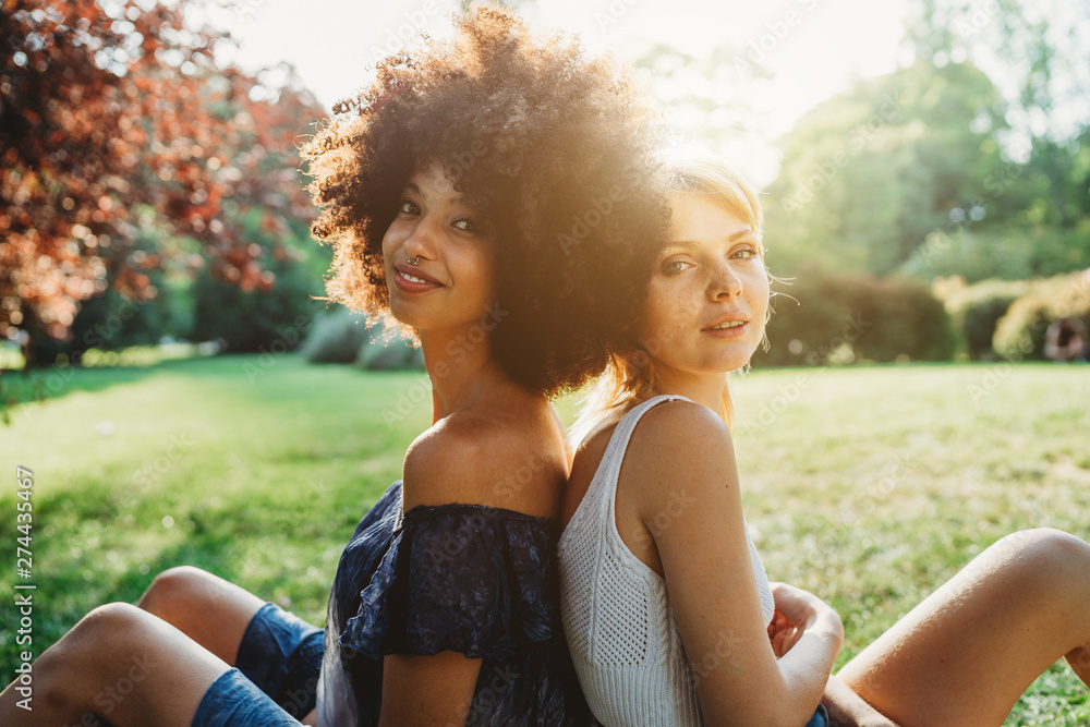 Back light portrait of two young women sitting with their backs against each other in a park at sunset - Millennials are resting on the grass