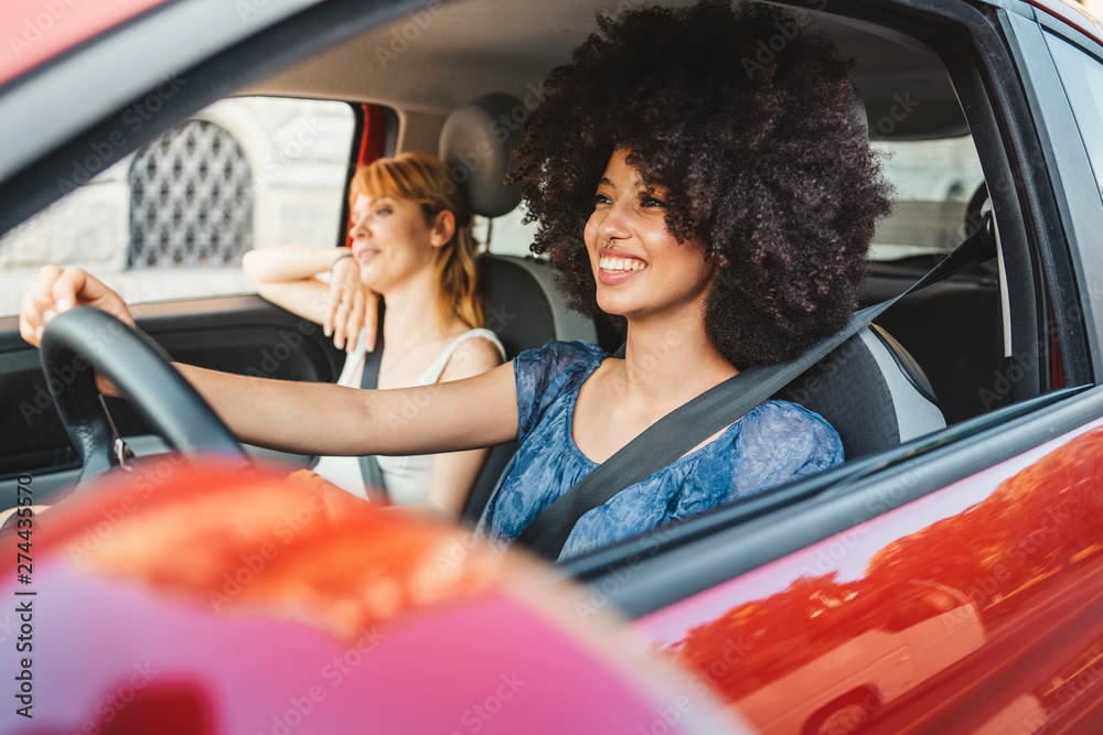 Two young women friends driving in the city - Millennials use the car to get around