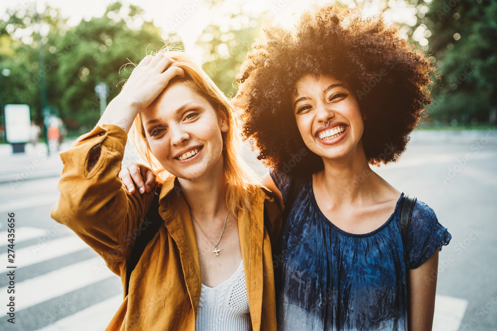 Portrait of two women friends at sunset - Two millennials, a blonde and a black girl with afro hair look at the camera, hugging each other