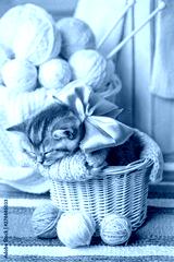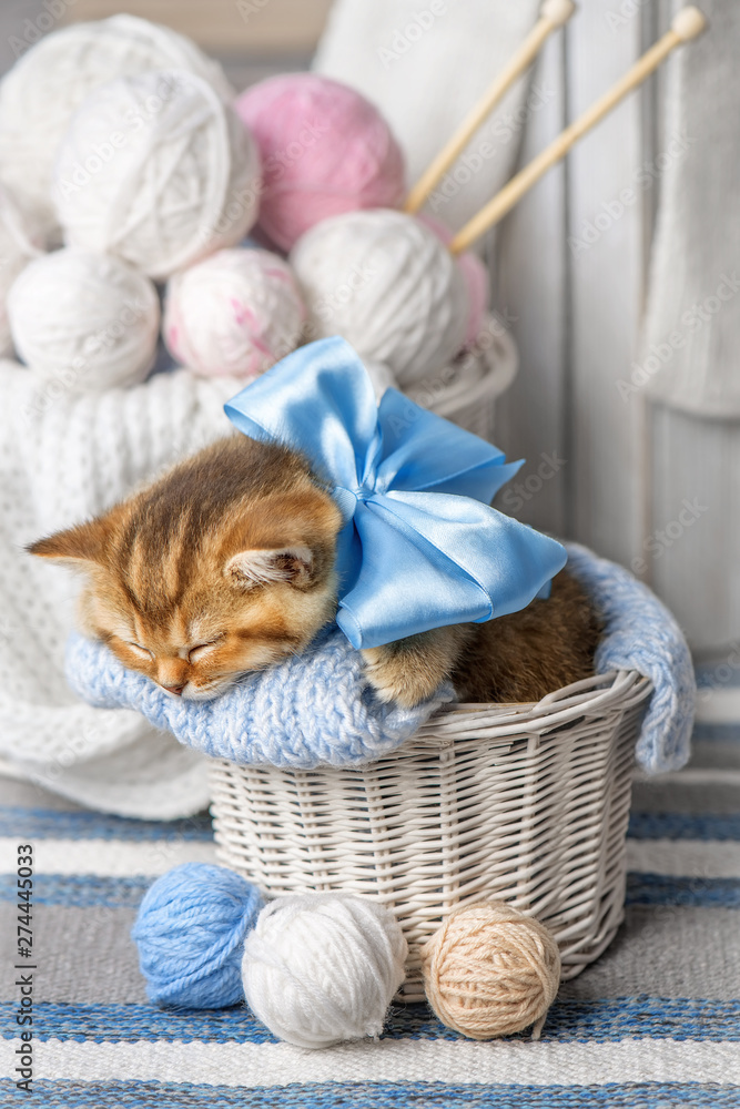 Cute kitten with a bow sleeping in a basket with balls of yarn