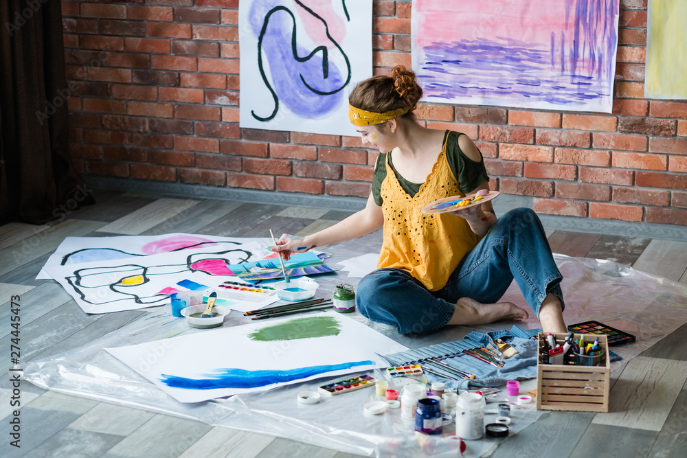 Modern art school. Female artist sitting on floor, painting abstract artworks. Creative workplace.