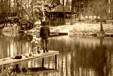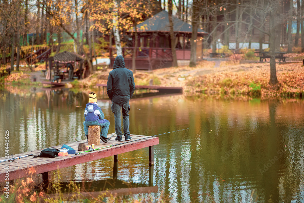 Adult and child on a wooden pier, fishing bridge. Autumn park. Fallen leaves, sunny day, natural background.
