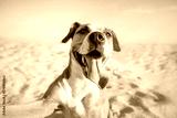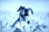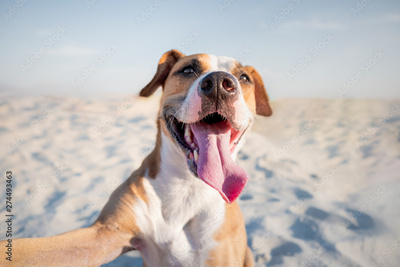 Happy smiling dog taking self portrait on the beach. Portrait of a cute staffordshire terrier imitating a selfie shot by the sea in the summer