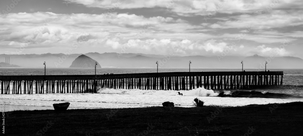 Black and White Pier Seascape with Surf Clouds and Morro Rock