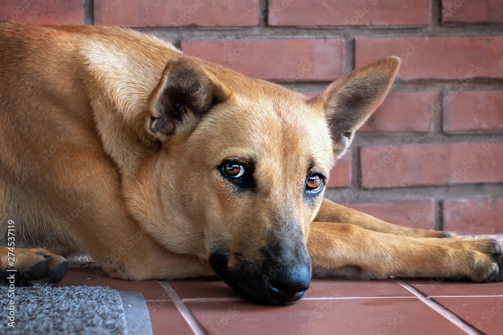 the mongrel dog lies and looks at her questioningly. Smart and sad look. Longing in beautiful eyes. close up.