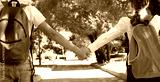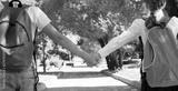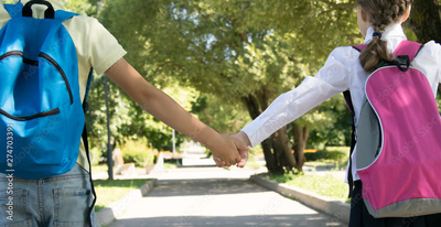 in the park, in the fresh air, close-up, schoolchildren holding hands, rear view