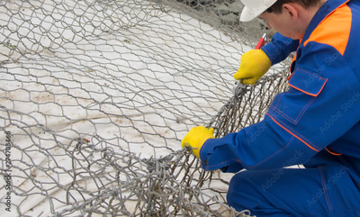 worker in blue uniform and white helmet repairing mesh for dirt stones, close-up