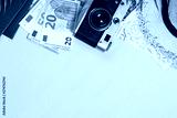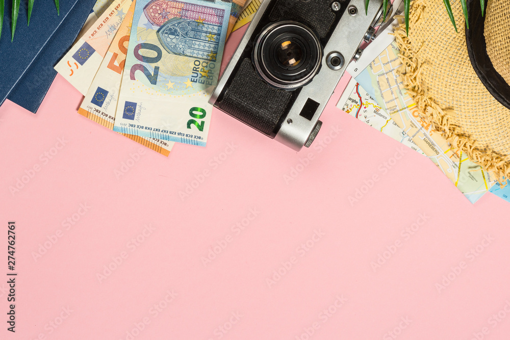 Summer travel concept on pink background top view.