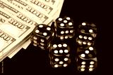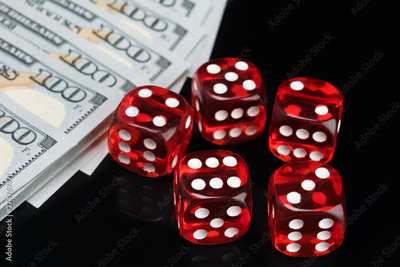 five red dice for gambling and hundred dollar bills on a black background