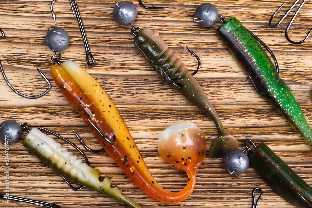 different shapes, colors and weights of bait for catching large fish lie on a burnt wooden background