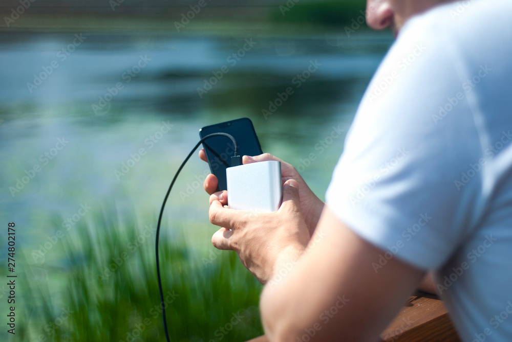 Men holds a portable charger with a smartphone in his hand on a background of nature with a greenery and a lake