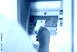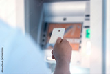 A man holds in his hand a mock-up of a white bank card near an ATM