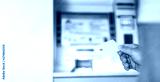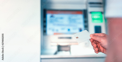 A man holds in his hand a mock-up of a white bank card near an ATM