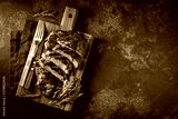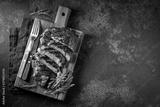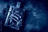 Sliced steak ribeye, grilled with pepper, garlic, salt and thyme served on a wooden cutting Board on a dark stone background. Top view with copy space. Flat lay