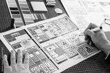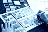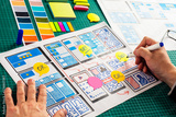 Designer of digital web products. Detailed web prototyping process. Web designer creates a landing page layout of the mobile application. Designing the user interface of the mobile application.