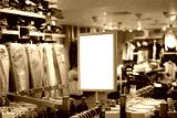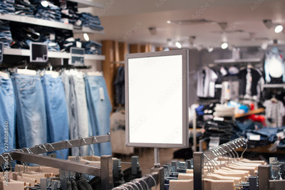 Mock up signs for sale on the background of hangers and clothes in a boutique.