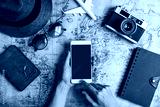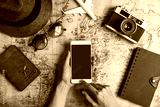 Retro camera with toy plane and smartphone on old world map background with copy space, Travel concept
