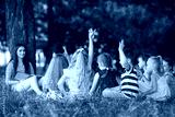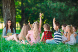 Children and education, young woman at work as educator reading book to boys and girls in park.