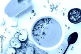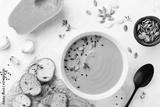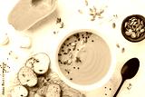 Autumn pumpkin cream soup in bowl served with seeds and crouton on white stone table top view.