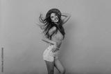 Gorgeous european young woman with red lips posing with hair waving. Indoor portrait of sporty caucasian girl in denim shorts standing on yellow background.