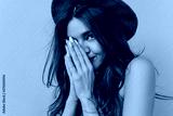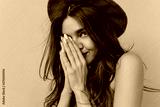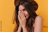 Indoor portrait of pretty caucasian girl with romantic hairstyle posing on yellow background. Wonderful white lady in hat having fun in studio.