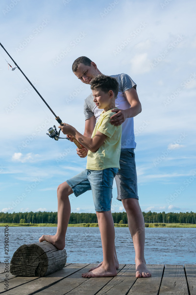 father teaches his son to keep spinning properly while fishing from a pier on the river