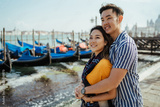 Loving couple on vacation in Venice, Italy - Millennials hugged on the quay, behind them the gondolas and the lagoon